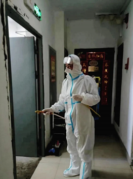 机关服务中心党员宋建同志进行楼道环境消杀工作