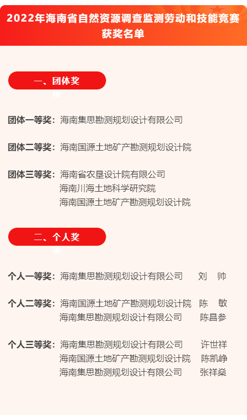 本次竞赛分为公开报名、报名资格审核和比赛三个环节,竞赛活动内容包括理论基础知识考核和上机实践操作考察。竞赛分个人赛和团体赛。经过层层激烈角逐,共评选出3项个人奖和3项团体奖。其中,海南集思勘测规划设计有限公司代表队荣获团体一等奖,海南集思勘测规划设计有限公司代表队的刘帅荣获个人一等奖;海南国源土地矿产勘测规划设计院两支代表队荣获团体二等奖,海南省农垦设计院有限公司代表队、海南川海土地科学研究院代表队、海南国源土地矿产勘测规划设计院一支代表队分别荣获团体三等奖。