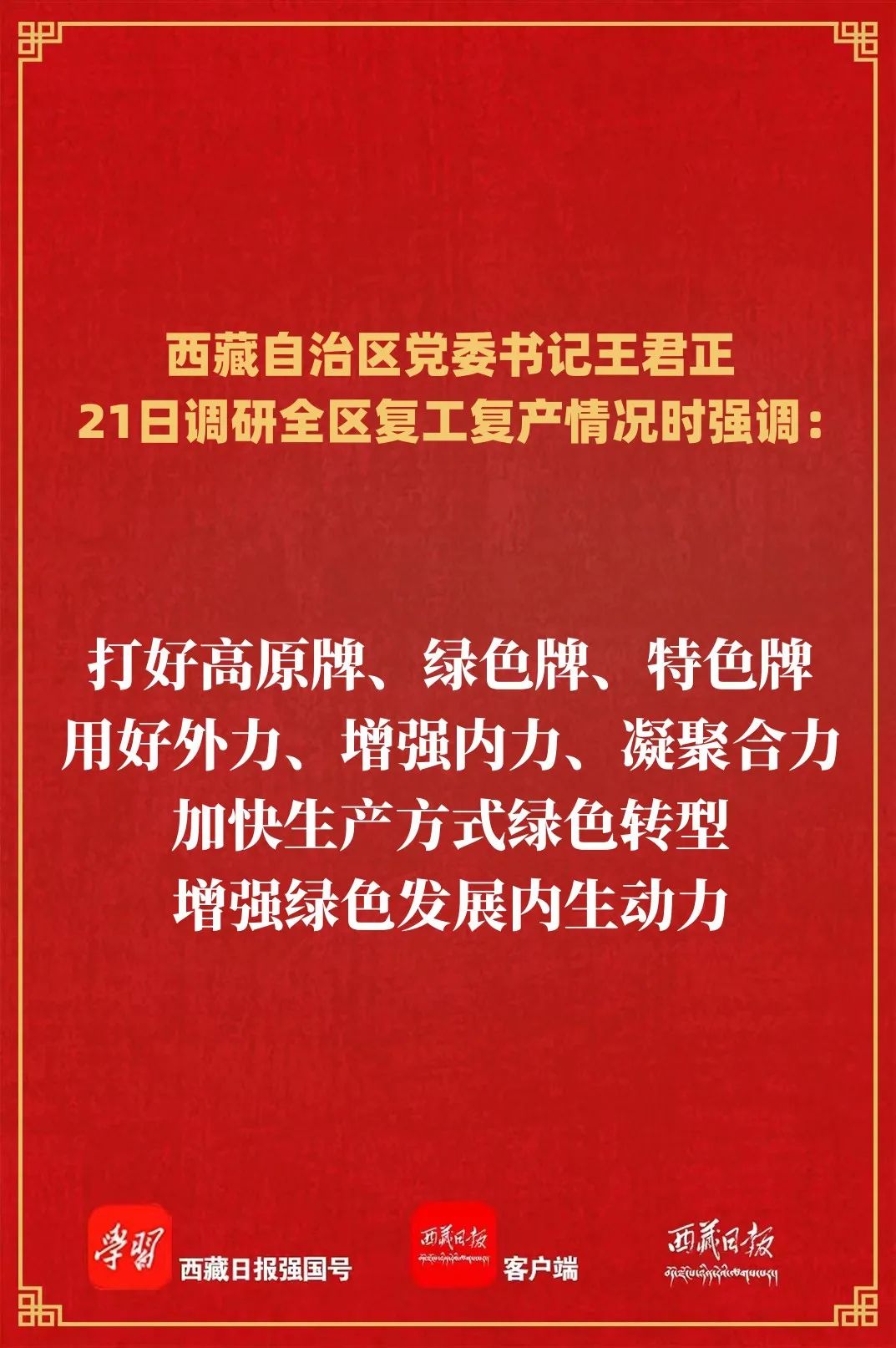 11月21日上午,自治区党委书记王君正调研全区复工复产情况时强调,要深入学习贯彻落实党的二十大精神,贯彻落实自治区第十次党代会和区党委十届三次全会部署,完整、准确、全面贯彻新发展理念,坚持“三个赋予一个有利于”,统筹疫情防控和经济社会发展,立足西藏特色优质资源禀赋和比较优势,持续优化一产、壮大二产、提升三产,优化营商环境,加快高原绿色产业培育发展,不断满足各族群众美好生活需要。