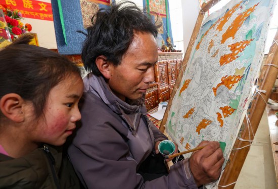 嘎桑坚参(右)在为唐卡上色(1月11日摄)。新华社记者 姜帆 摄