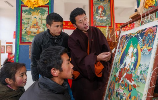 西绕尼玛(右一)在讲解关于唐卡绘制的知识(1月11日摄)。新华社记者 姜帆 摄