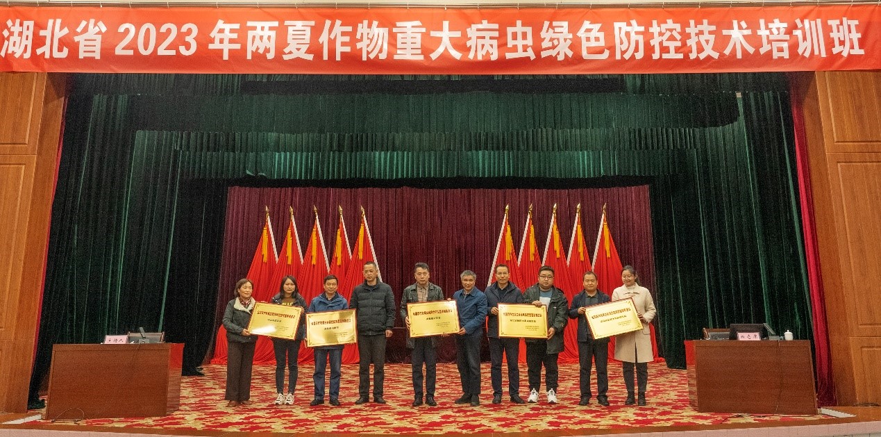 培训班邀请了华中农业大学姜道宏教授、中国农科院油料作物研究所唐晓倩副研究员分别围绕油菜主要病害及绿色防控、ARC菌剂提质固氮绿色增产关键技术研究进展进行了培训。参会企业代表对小麦油菜重大病虫绿色防控新产品、新技术进行了宣传讲解。会上,省植保总站站长郭子平为我省第二批全国农作物病虫害绿色防控整建制推进县、首批全国农作物病虫害绿色防控技术示范推广基地举行了授牌仪式。培训班还参观了宜城市小麦赤霉病全生育期综合防控示范区、油菜病虫害绿色防控示范区及小麦、油菜植保贡献率试验区,现场观摩了夏粮夏油重大病虫绿色防控药剂展示和新型植保无人机施药作业展示。