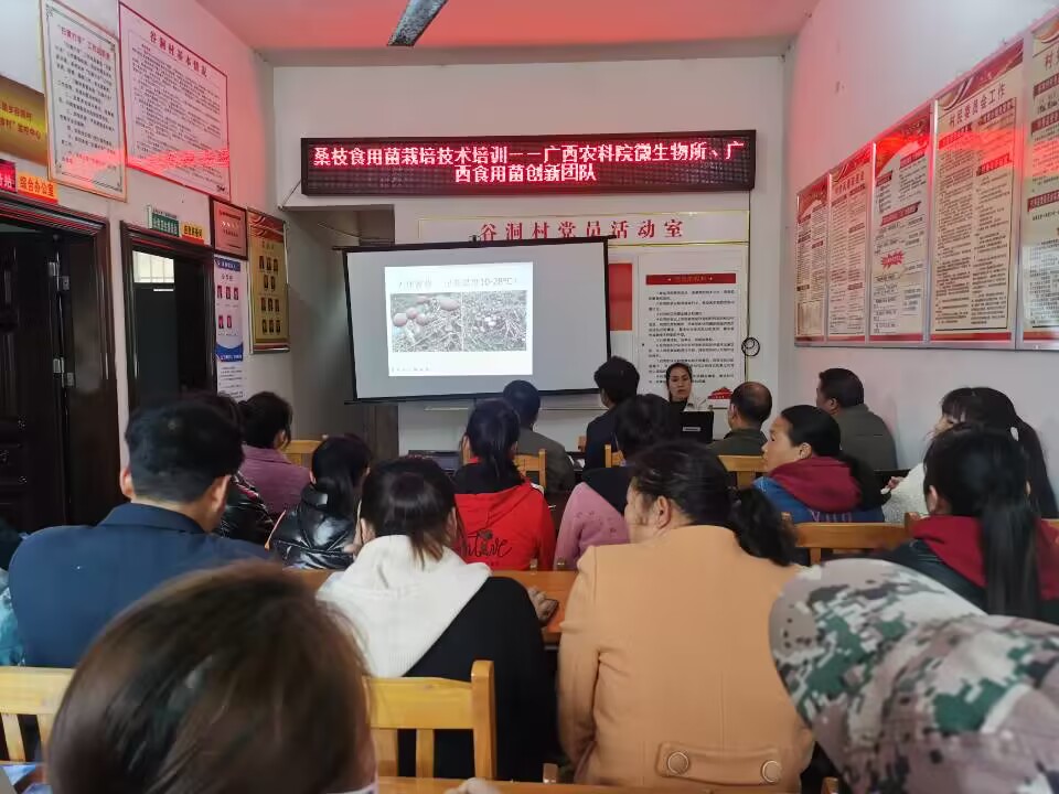 3月28日,应河池民族农业学校、河池市宜州区农业农村局邀请,广西食用菌创新团队功能专家团队成员、宜州桑枝食用菌试验站专家、广西乡村科技特派员陈雪凤和张雯龙一行2人赴宜州区刘三姐镇谷洞村开展食用菌技术培训,谷洞村农户共33人参加培训。