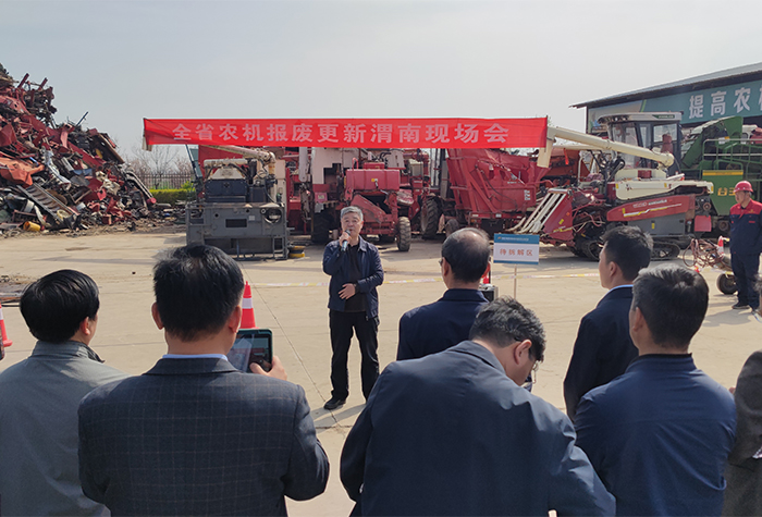 在渭南市临渭区锦绣农机专业合作社,理事长向参会人员汇报了老旧农机回收拆解的流程和做法,参会人员现场观摩了渭南市临渭区农机报废更新“一站式”服务办理情况,观看了联合收割机、拖拉机现场拆解,察看了回收机具档案管理。