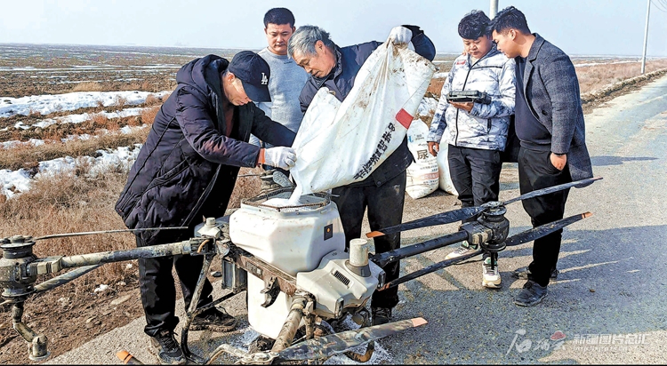 在乌苏市西湖镇柳墩村,村民向准备作业的植保无人机内添加肥料(3月8日摄)。□乔玉凯摄