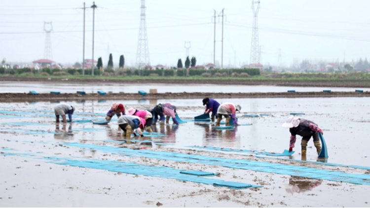 在大田播种现场,村民们正细致地把秧田整平,摆上育秧软盘,覆上大田泥浆,再用扫帚扫平泥浆,随后抛下谷种、盖上薄膜,大家分工合作,一派繁忙景象。