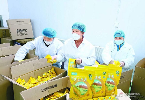 3月29日,在沙湾市乌兰乌苏镇城庄子新村,沙湾市谷香园食品有限责任公司的工人正在分装粮食产品。□关兵摄