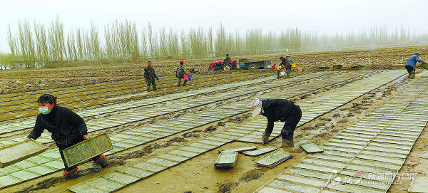 4月3日,当地农民在温宿县富硒试验田里进行水稻育苗前的准备工作。□陈长青摄