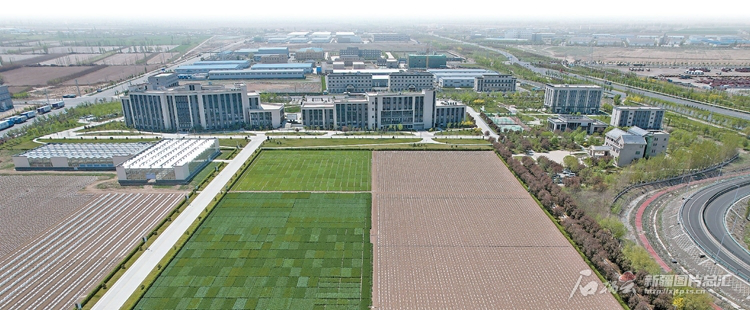 九圣禾种业股份有限公司产业园科研创新基地展示区种植的农作物(5月10日无人机拍摄)。该公司在全国建有15个育种中心,先后在全国建立50万亩稳定的制种基地、15条现代化种子加工生产线和配套仓储物流设施,各类种子生产加工能力达30万吨。□石榴云/新疆日报记者邹懿摄