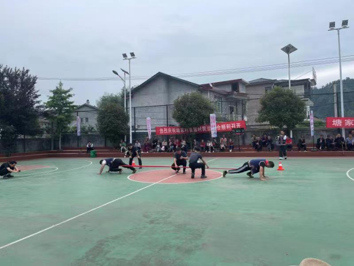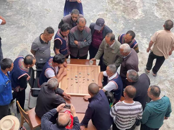 揭牌仪式结束和村民运动会开幕之后,出席今天活动的领导和嘉宾饶有兴味地观看了塘家村和柏树村的篮球对抗赛,传统体育项目打三棋、高脚马和押加等比赛项目。此次塘家村首届村民运动会既包括了农民群众喜闻乐见、参与度高的篮球、拔河、挑担子、象棋等比赛项目,也有少数民族特色鲜明的打三棋、押加、高脚马等传统体育比赛项目,比赛村民参与度高,生产生活性强,乡愁趣味浓厚,吸引了村里及相邻乡村的众多村民来参加比赛和加油助威。