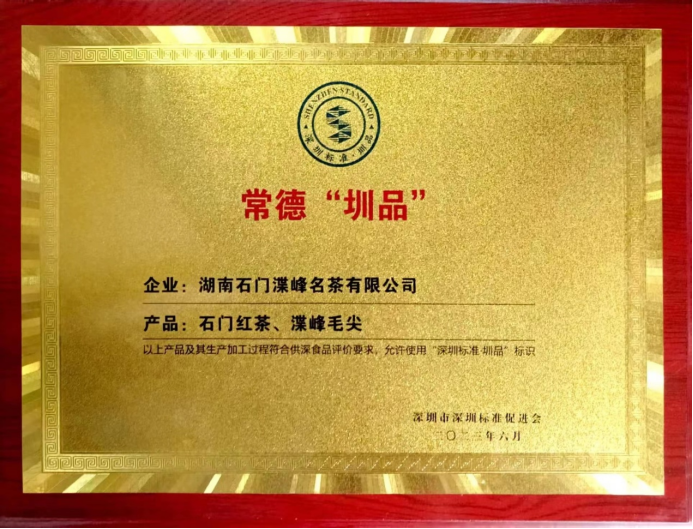 2021年10月31日,湖南石门渫峰名茶有限公司生产的茶叶产品(红茶、绿茶)及其生产加工过程符合供深食品评价要求,允许使用“深圳标准•圳品”标识,成为常德市首家通过“圳品”认证的茶企。