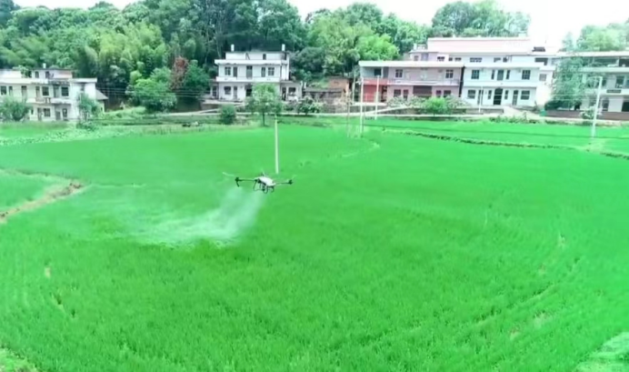 6月30日,在八宝镇双兴村,一台无人植保机“嗡嗡”地正在一片碧绿的农田上空螺旋移动、前后翻转,祁阳四季红病虫害防治专业合作社的农机手正站在田埂上熟练地操作着遥控手柄,利用无人植保机正在为当地种粮大户黄飞种植的水稻进行病虫害防治喷洒,不到半个小时就飞遍了30多亩水稻田。