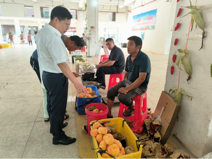 图为:祁阳市农业农村局党组书记、局长詹国平在促销现场向果农了解生产销售情况