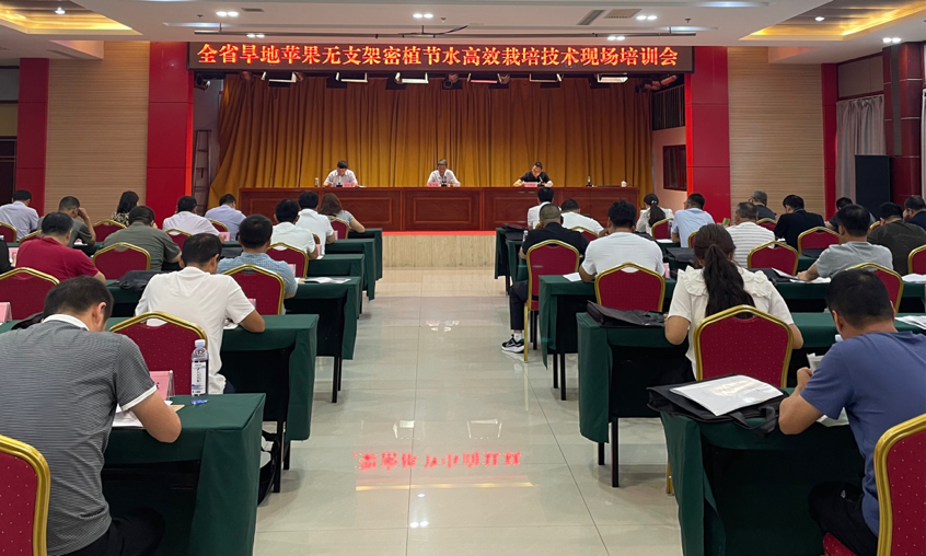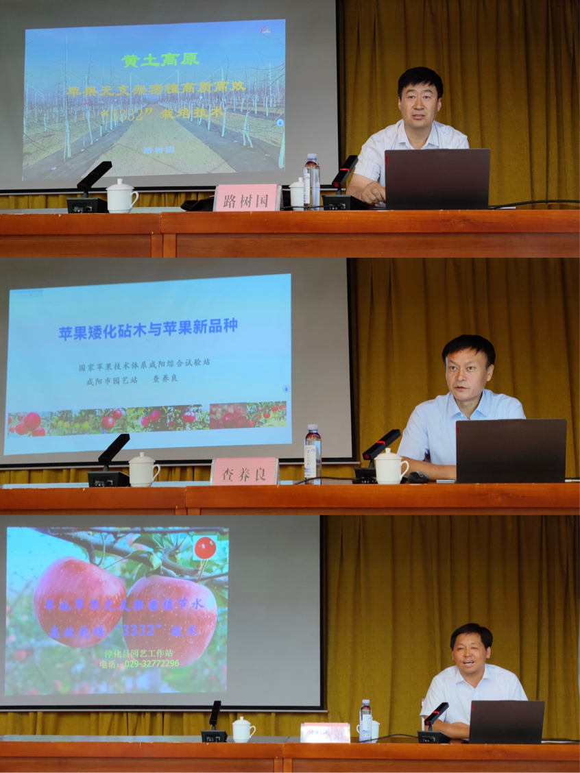 本次培训紧扣旱地苹果无支架密植节水高效栽培,邀请了延安市果业中心主任、高级农艺师路树国,咸阳市园艺站站长、推广研究员查养良,淳化县园艺工作站站长、高级农艺师赵小弟分别就黄土高原旱地苹果无支架密植节水高效栽培“3332”模式技术要点、苹果砧木与苹果新品种和“3332”模式推广实践进行了专题授课。