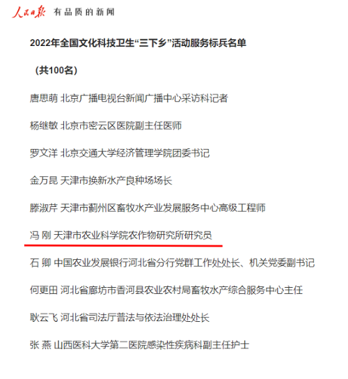近日,中央宣传部公布2022年全国文化科技卫生“三下乡”活动示范项目、优秀团队、服务标兵名单,市农科院作物所冯刚研究员荣获2022年全国文化科技卫生“三下乡”活动服务标兵称号。