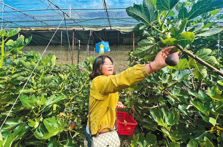 图为市民在拉萨市达孜区纯净生态采摘园内采摘无花果。记者 潘多 摄