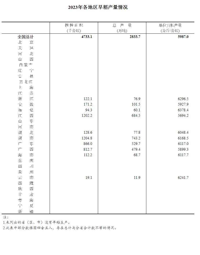 根据早稻抽样调查结果推算,2023年全国早稻播种面积、单位面积产量、总产量如下:
