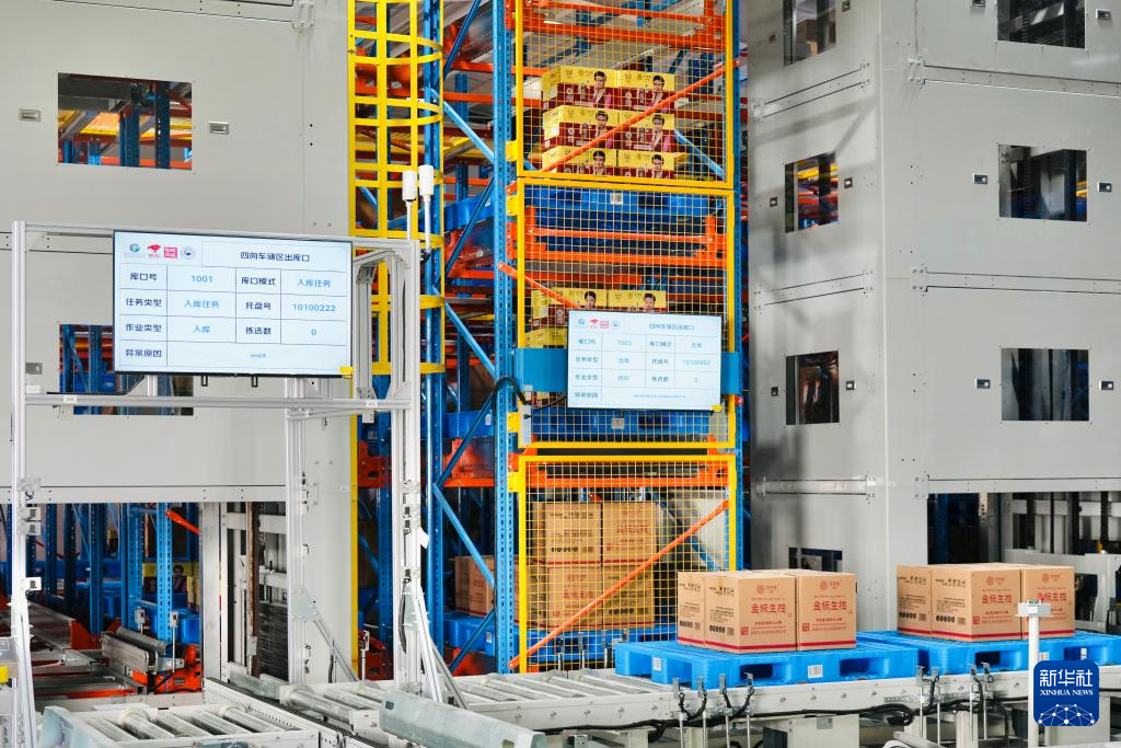 西藏林芝农产品前置智能仓内,林芝松茸酱油货物正在整托出库。(李昕玮摄)