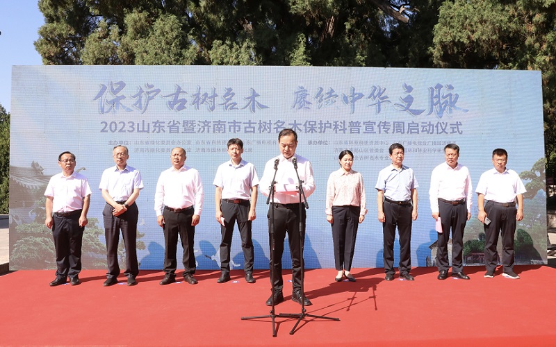 9月22日上午,山东省古树名木保护科普宣传周活动启动仪式在济南市柳埠林场举行。本次活动由山东省绿化委员会办公室、山东省自然资源厅、山东广播电视台、济南市绿化委员会办公室、济南市园林和林业绿化局联合主办,邀请省公安厅、省住房城乡建设厅、省文化和旅游厅参加,省自然资源厅二级巡视员李成金出席活动并致辞。