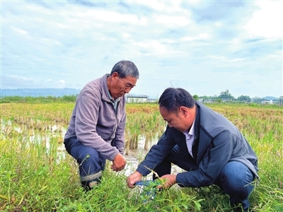 星桥镇两路村十二组,杜江东(右)和村民一起查看高标准农田灌溉管道出水情况。记者 张晓庆 供图