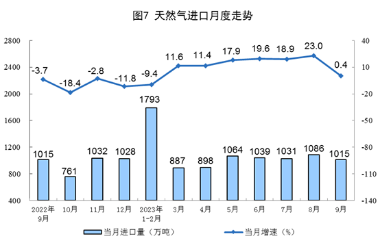 1—9月份,生产天然气1704亿立方米,同比增长6.4%。进口天然气8777万吨,同比增长8.2%。