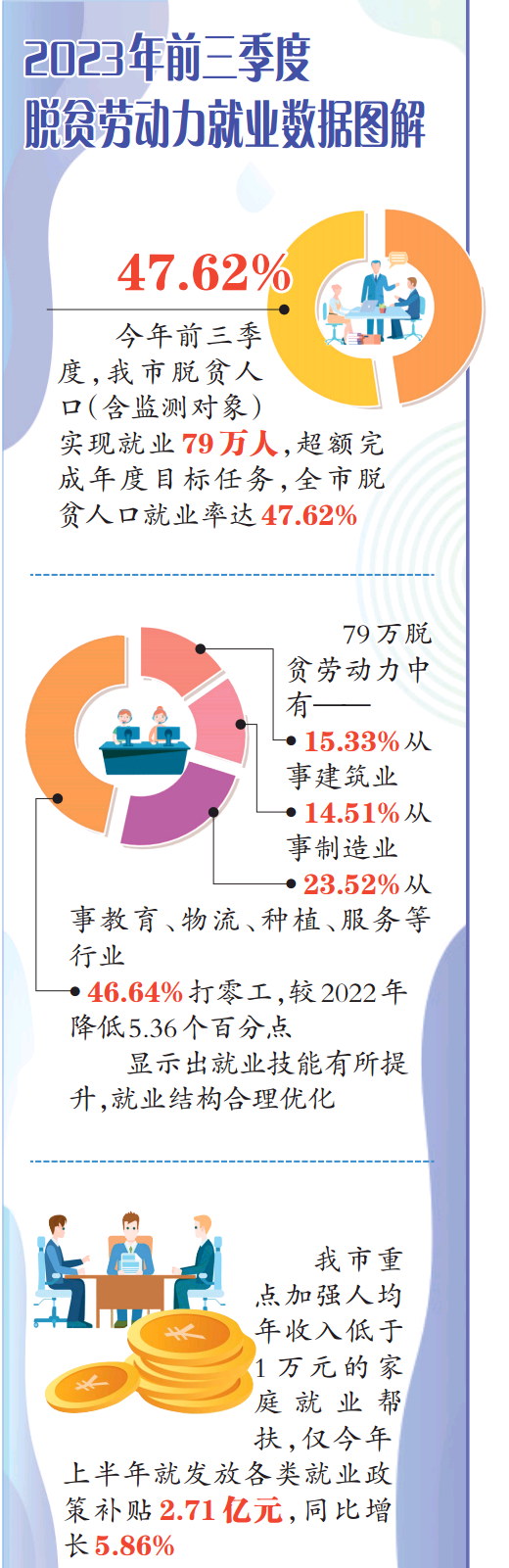 “增”指的是就业规模逆势增长。“优”即是指就业结构不断优化。统计显示,79万脱贫劳动力中有15.33%从事建筑业,14.51%从事制造业,23.52%从事教育、物流、种植、服务等行业。46.64%打零工,较2022年降低5.36个百分点,显示出就业技能有所提升,就业结构合理优化。“大”即政策帮扶力度持续加大,我市重点加强人均年收入低于10000元的家庭就业帮扶,仅今年上半年就发放各类就业政策补贴2.71亿元,同比增长5.86%。