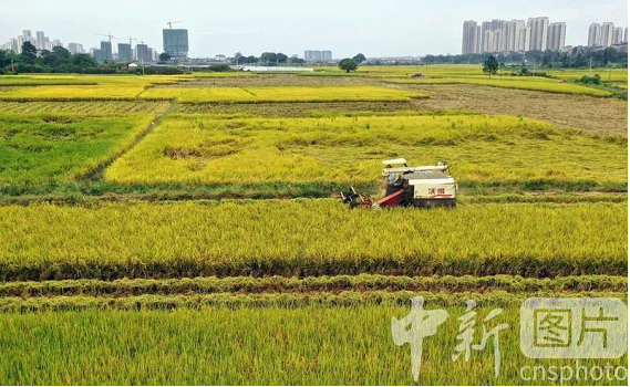 2023年10月7日,江西省吉安市永丰县恩江镇岭上村,农民在恩江灌区高标准农田中收割晚稻。寒露时节,江西省吉安市永丰县广大农民抢抓农时加紧收割晚稻,确保秋粮颗粒归仓。今年,当地积极落实惠农政策,农田水利灌溉、农业技术服务等保障有力,全县水稻生产实现旱涝保收。中新社发刘浩军 摄