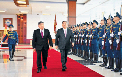 扎帕罗夫在机场为李强举行隆重欢迎仪式。军乐队高奏中吉两国国歌。李强在扎帕罗夫陪同下检阅了仪仗队。