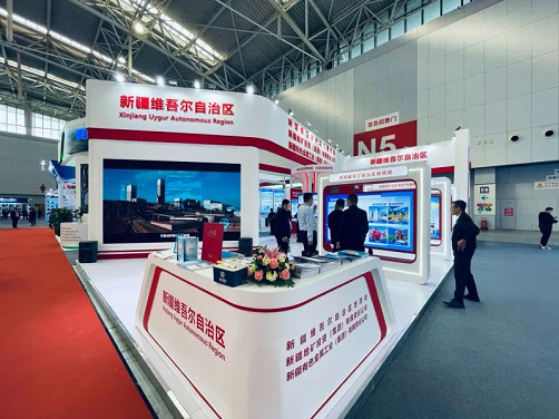 新疆维吾尔自治区展位设计深入贯彻落实习近平生态文明思想,立足自治区自然资源禀赋,紧扣新一轮找矿突破战略行动主题,通过宣传册、宣传片、展板、矿业权合作洽谈等形式,介绍新疆新一轮找矿突破战略行动工作部署情况,向世界推介自治区矿产资源基本情况、服务领域以及在地质矿产勘查、生态文明建设、地质科技创新等方面取得的辉煌成就。