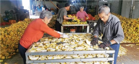 在近千平方米的车间里,飞速运转的3台切片机将黄色的鲜佛手切成均匀的片状,农民工将它们铺在多层的钢架上,然后推进烘干室,恒温烘烤24小时成干品后,再装袋打包外运。