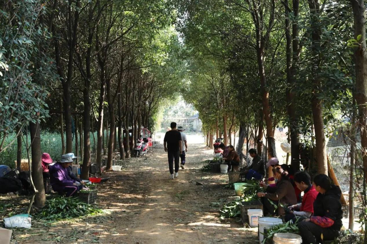 走进共青城市江益镇跃进村山香圆繁育种植示范基地,一股中药材的香气扑面而来,车辆载着一筐筐山香圆叶子,沿着林间小路缓缓地运出,工人们也在林子边进行采叶,采摘下来的叶子经过精选、晾晒、切丝等工序后,就可以包装进行销售,不远处的育苗大棚里,山香圆幼苗长势良好,水通过喷灌设备喷洒而下,为幼苗成长提供养分,不久后,它们将移栽到林下继续成长。