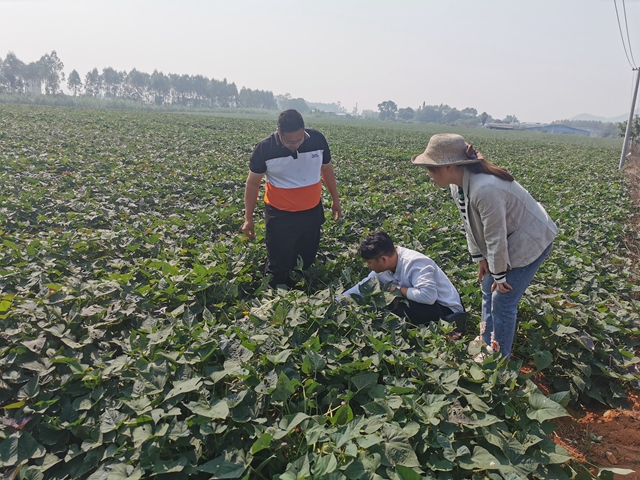 调研组首先到柳州市农华红薯种植专业合作社红薯种植基地进行了实地考察,合作社主要负责人韦传统就基地基本情况做了详细介绍。该合作社于2018年开始种植红薯,2023年红薯种植面积有600多亩,主要品种为西瓜红,预计平均亩产约4500斤,亩产值约4500元,主要销往各大果蔬批发市场供零售鲜食。随后双方就红薯高产高效栽培技术进行了交流讨论,调研组针对红薯地下害虫防治和苗期除草及施肥控旺技术方面,给予了针对性的技术指导;同时对合作社面临的产品销售困难等现实问题,调研组给合作社负责人指出了今后的发展方向和意见建议。