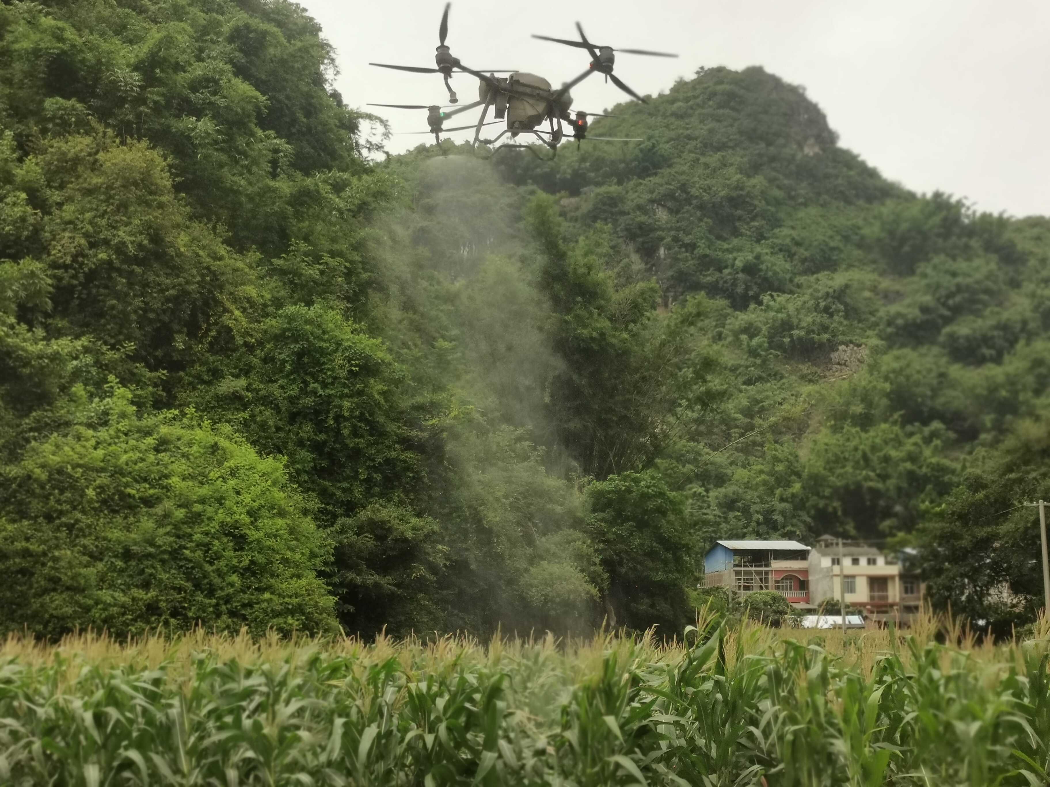 图为百色市田阳区2023年秋粮(玉米)“一喷多促”飞防现场