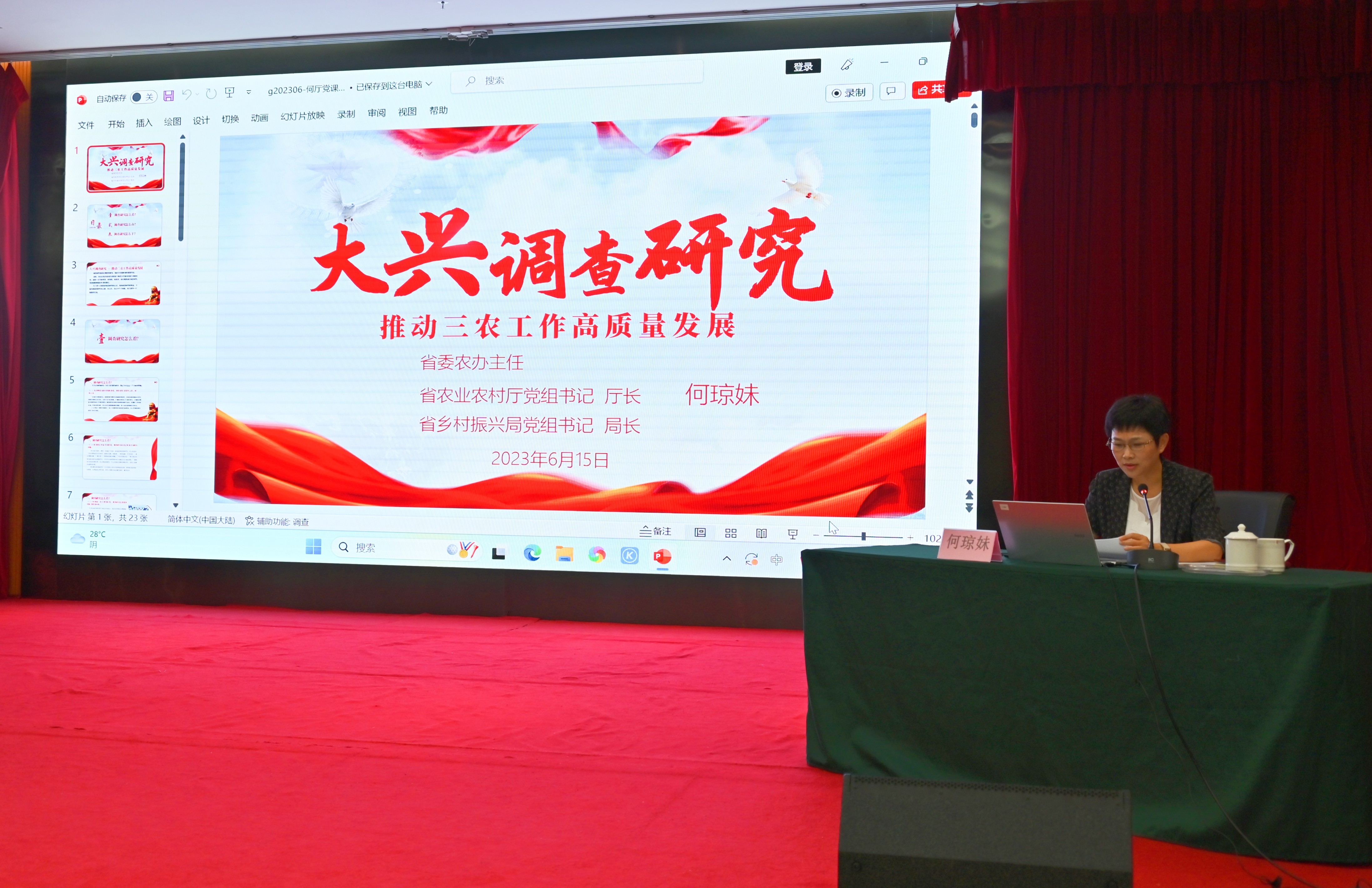 为深入推动学习贯彻习近平新时代中国特色社会主义思想主题教育走深走实,根据主题教育工作安排,6月15日,省委农办主任,省农业农村厅党组书记、厅长,省乡村振兴局党组书记、局长何琼妹同志以《大兴调查研究推动三农工作高质量发展》为题,为厅局党员干部讲授学习贯彻习近平新时代中国特色社会主义思想主题教育专题党课。
