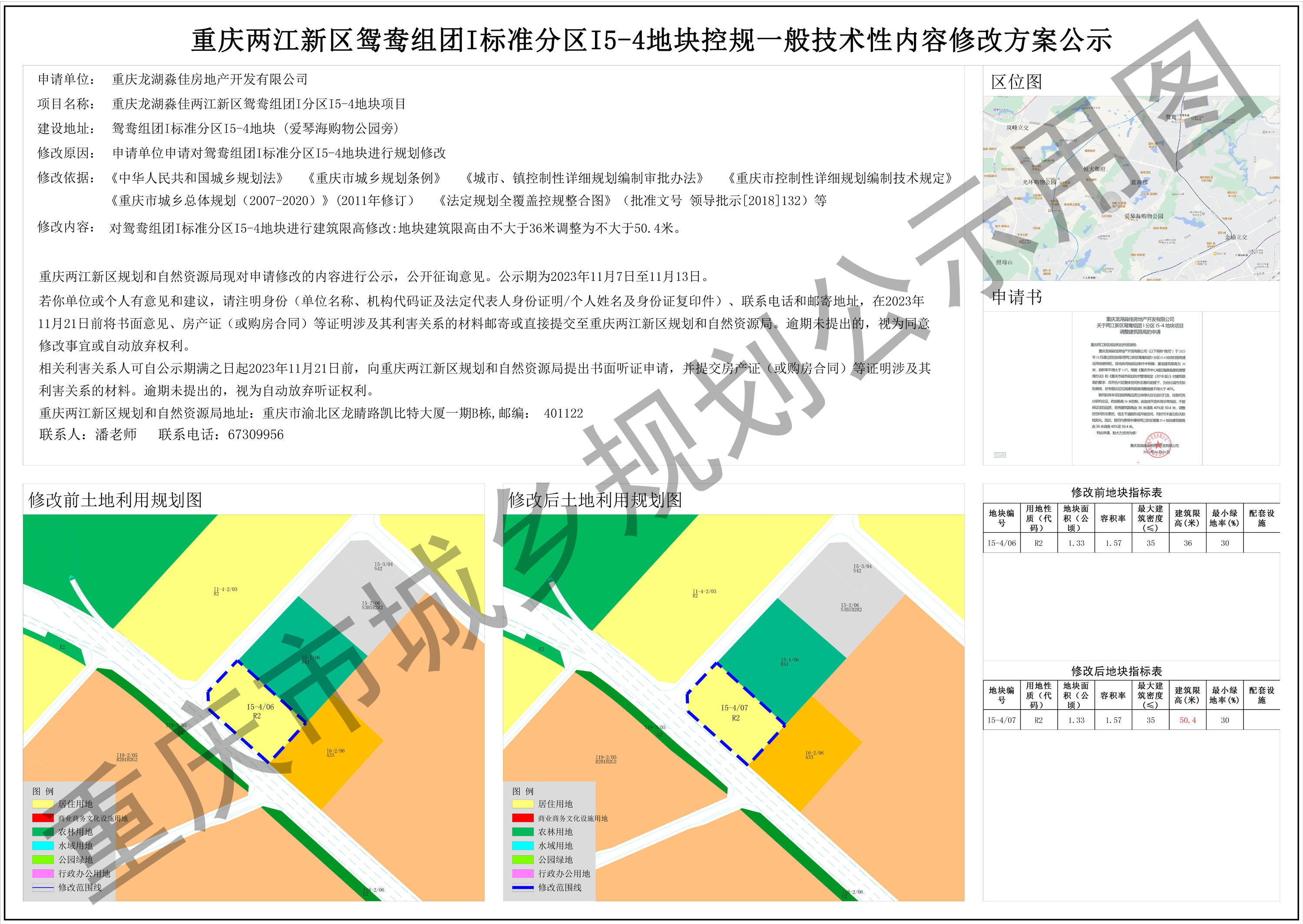 重庆两江新区鸳鸯组团I标准分区I5-4地块控规一般技术性内容修改方案公示