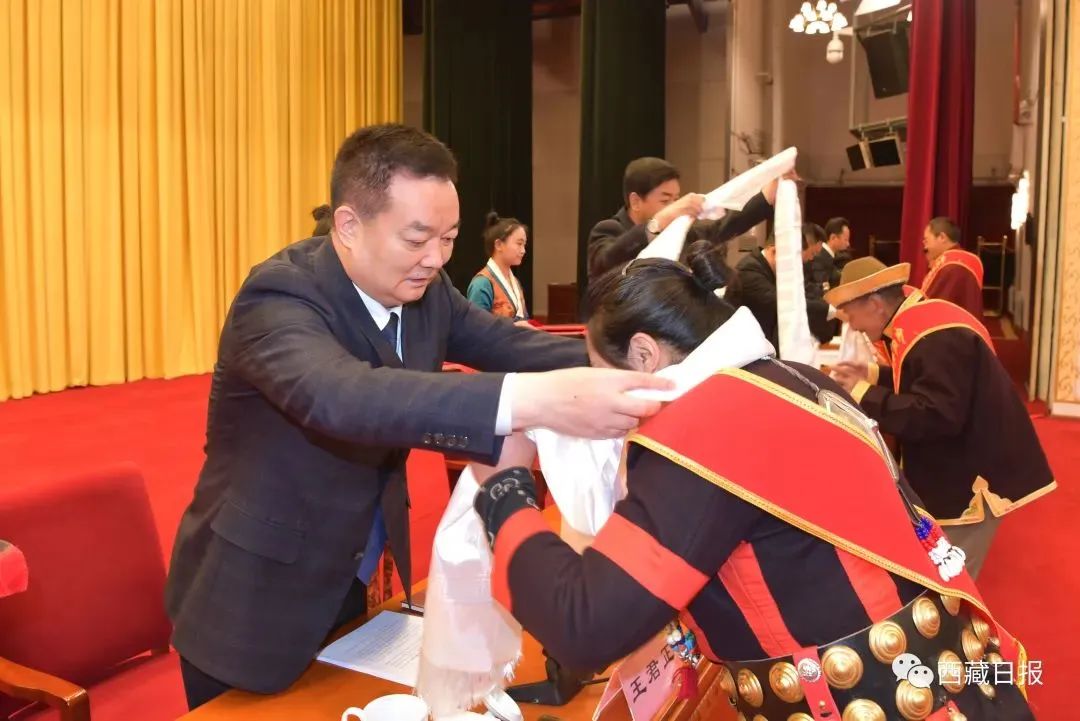 全区生态环境保护大会11月6日在拉萨召开。自治区党委书记王君正出席并讲话。这是王君正为受表彰的全区生态文明建设先进个人献上哈达。记者 旦增西旦 摄