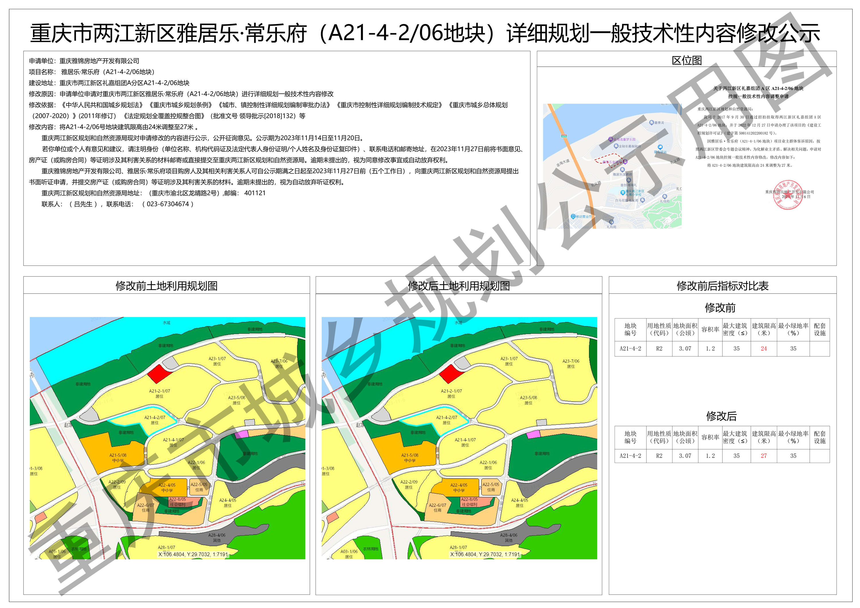 重庆市两江新区雅居乐·常乐府(A21-4-2/06地块)详细规划一般技术性内容修改公示