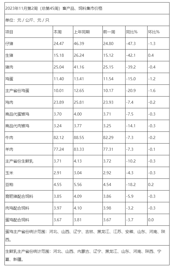 据对全国500个县集贸市场和采集点的监测,11月份第2周(采集日为11月8日)生猪、豆粕价格环比上涨,仔猪、猪肉、家禽产品、牛羊产品、玉米、育肥猪配合饲料、肉鸡配合饲料价格下跌,蛋鸡配合饲料价格持平。