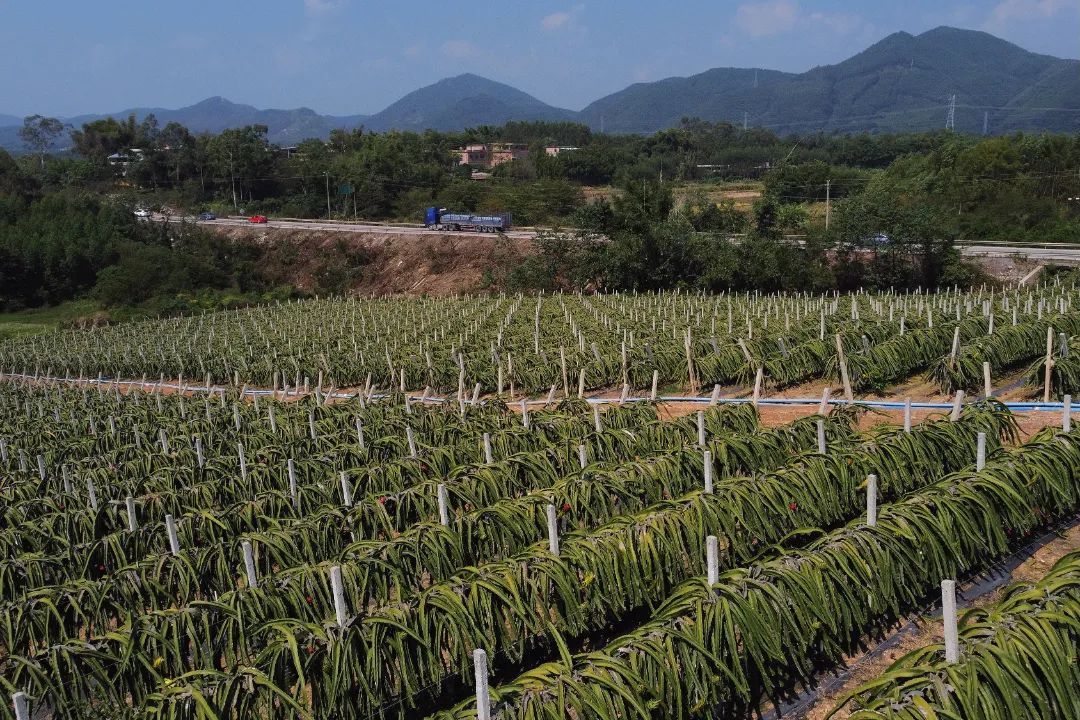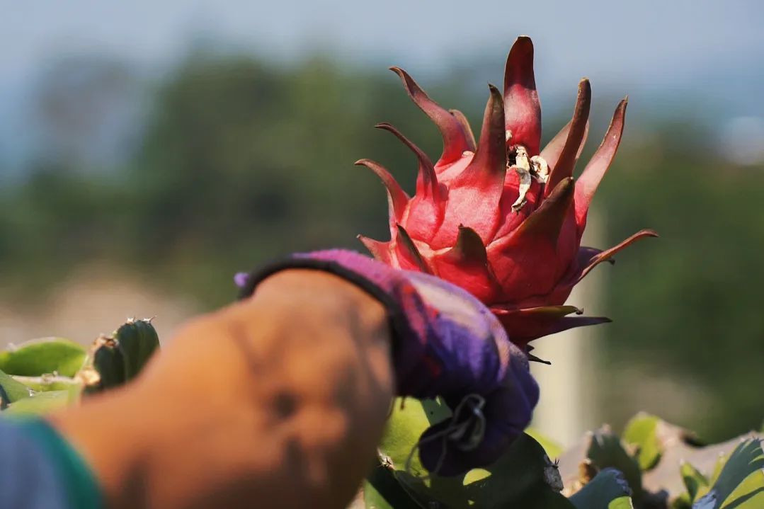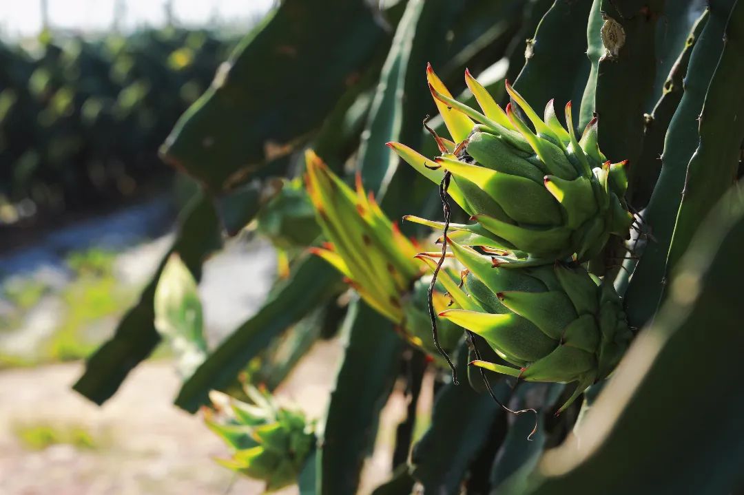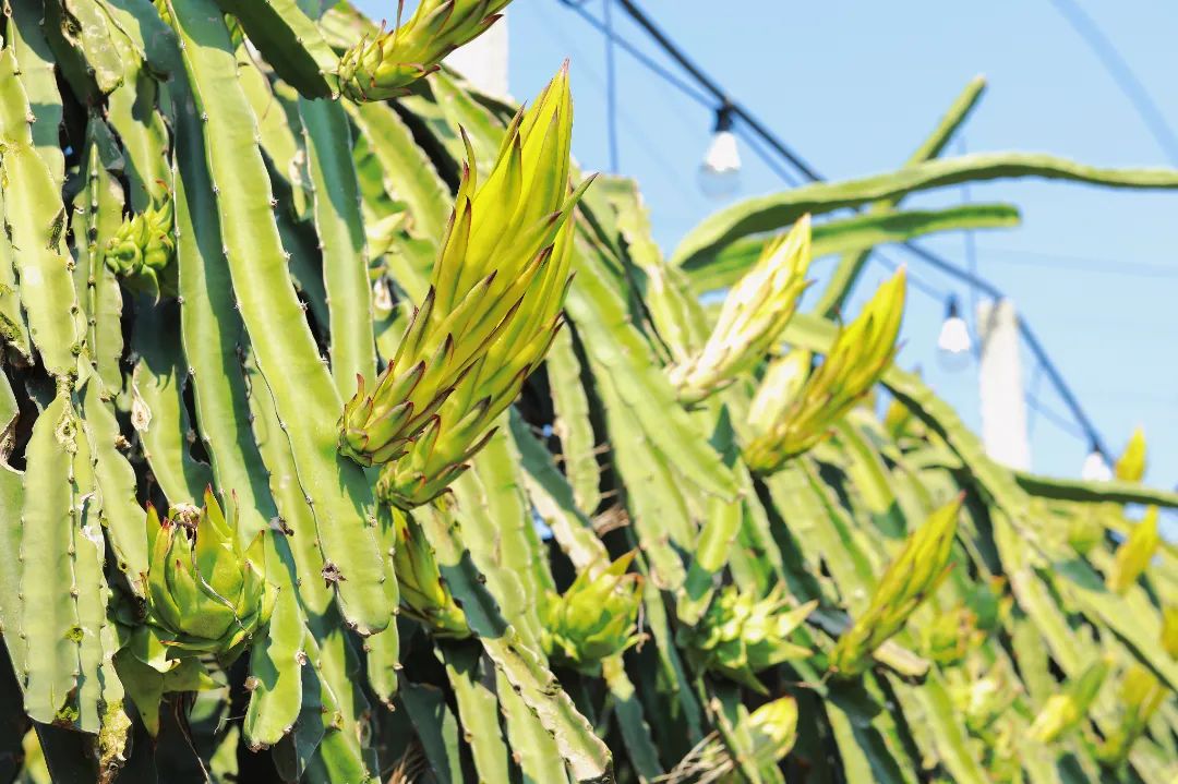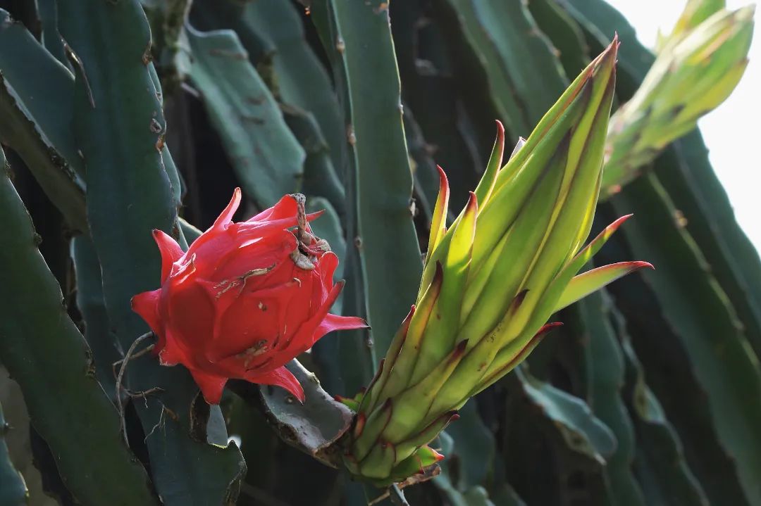 近日,记者走进兴宁区五塘镇六塘坡火龙果基地,饱满娇红的火龙果在艳阳的照耀下,肆意生长,如火焰般逐渐燃起。基地里一排排形似仙人掌枝茎粗壮茂盛,有的刚长出嫩绿的幼果,有的已经结成了红彤彤的熟果,长势喜人,挂满枝头,煞是好看。