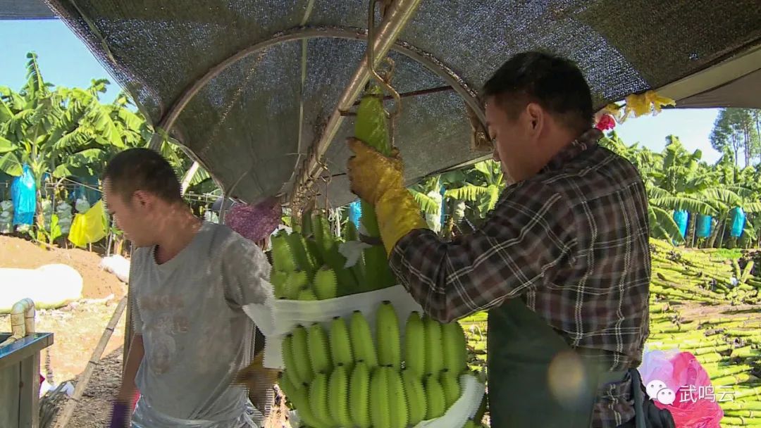 广西福鑫丰现代农业有限公司负责人 高增城:目前香蕉已经进入丰收的采摘期,我们亩产量达到6000到6500多斤,市场价格大概是1.6~1.7元,目前我们的产值1000多万元左右。