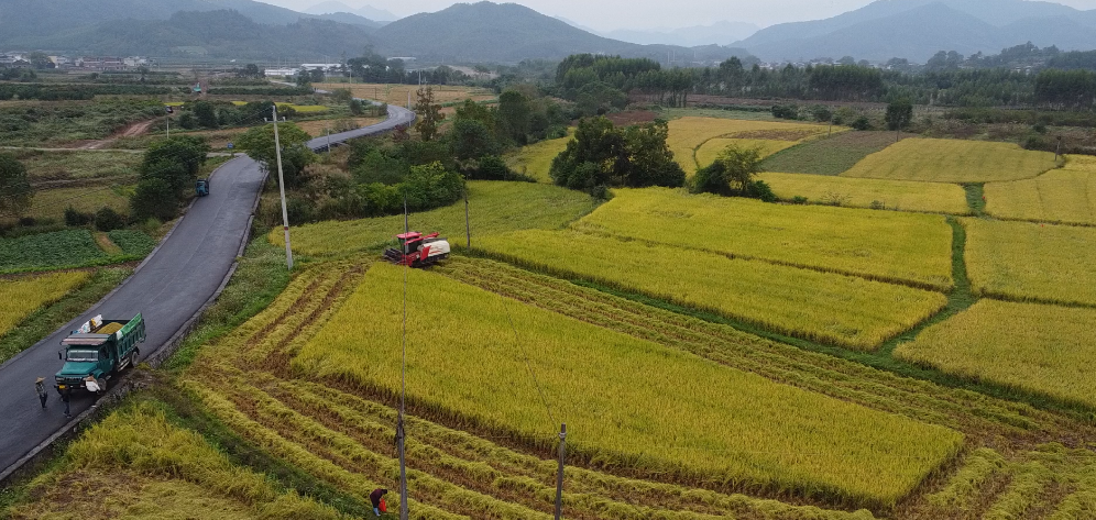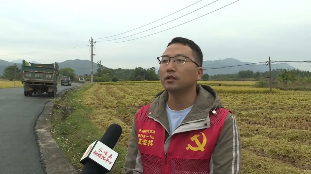 大苏村驻村第一书记莫宏祥:“今年风调雨顺,我们村联合社种植的双季水稻都获得了丰收,预计亩产八百斤干谷子,现在我们正在抓紧时间收割,为冬季种植油菜做好准备。”
