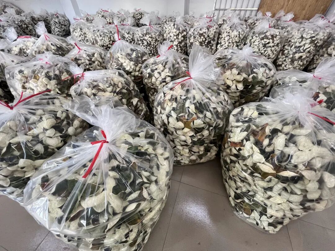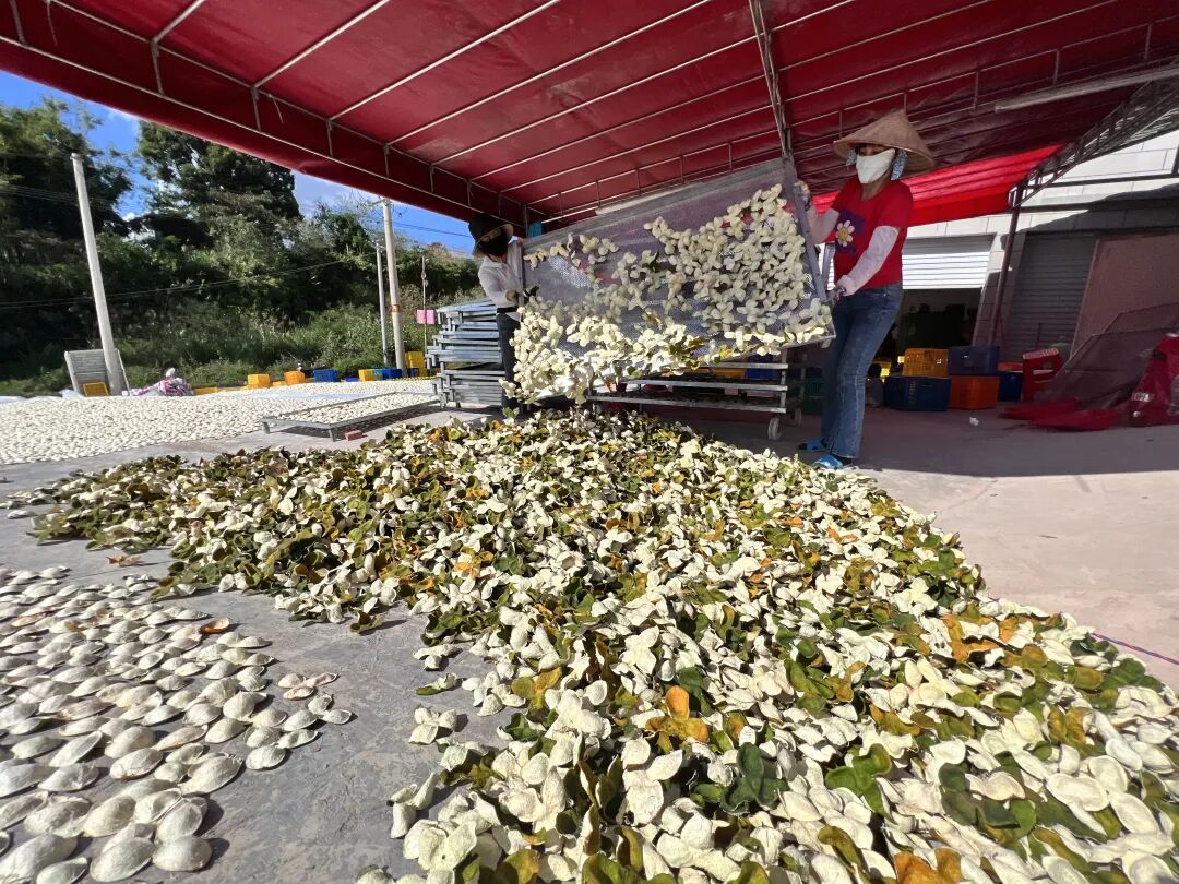 眼下正值柑果的丰收季,走进防城区那良镇四会柑果皮仓储交易中心,60多名工人正在给已清洗的柑果进行开果、翻皮、烘干、晾晒……每个步骤都有条不紊地进行着。晒场上,铺满的果皮在太阳下晒着“日光浴”,空气中弥漫着柑果的清香。据了解,这些工人都是来自那良镇的村民,那良镇四会柑果皮仓储交易中心的投产,给她们带来了就业的机会。“我是那良安置点的群众,在这里工作离家近,方便照顾孩子,工资也可观,我挺开心的。”脱贫户李文燕说道。“我们公司是今年九月份开始投产的,按照现在每天收果5万斤来算,1天剥果皮的量是2万斤,大概需要60—80个工人就业,脱贫户在我们这务工的就有30多个。工人工资我们按天结算,剥果皮的0.2元/斤果。晒皮的,按小时工12元/小时。工人一天的收入能拿到180元左右。”广西尚佳包装科技有限公司负责人胡林军说道。该公司合作经营的那良镇四会柑果皮仓储交易中心及种植基地项目现可容纳80多人灵活就业,提供固定就业岗位10个以上,有效解决了就业问题,不少群众在“家门口”就能实现就业的梦想。