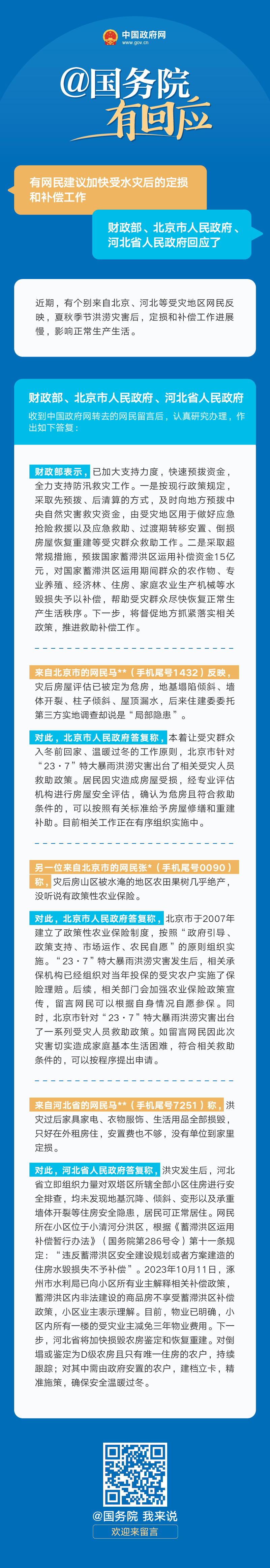财政部、北京市人民政府、河北省人民政府答网民关于“建议加快受水灾后的定损和补偿工作”的留言
