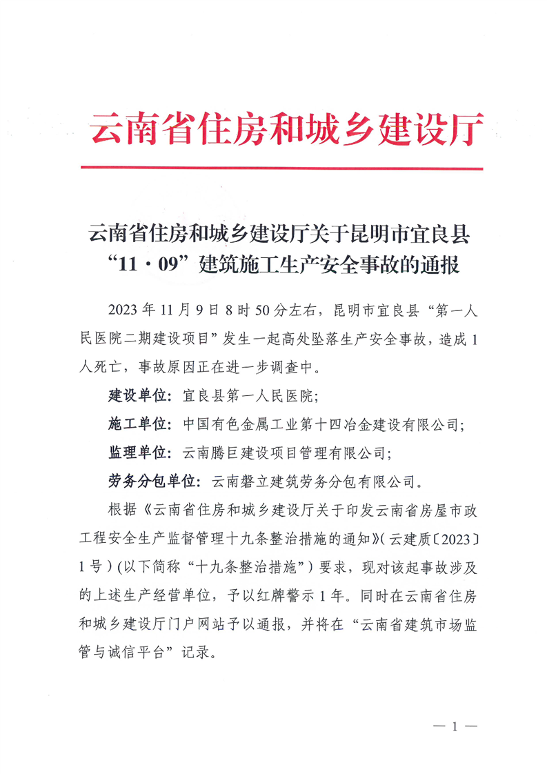 云南省住房和城乡建设厅关于昆明市宜良县“11.09”建筑施工生产安全事故的通报