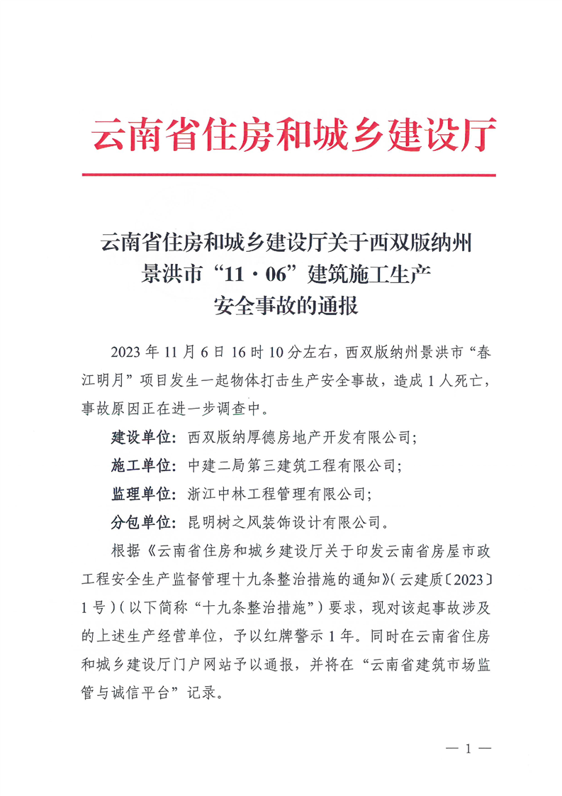 云南省住房和城乡建设厅关于西双版纳州景洪市“11.06”建筑施工生产安全事故的通报