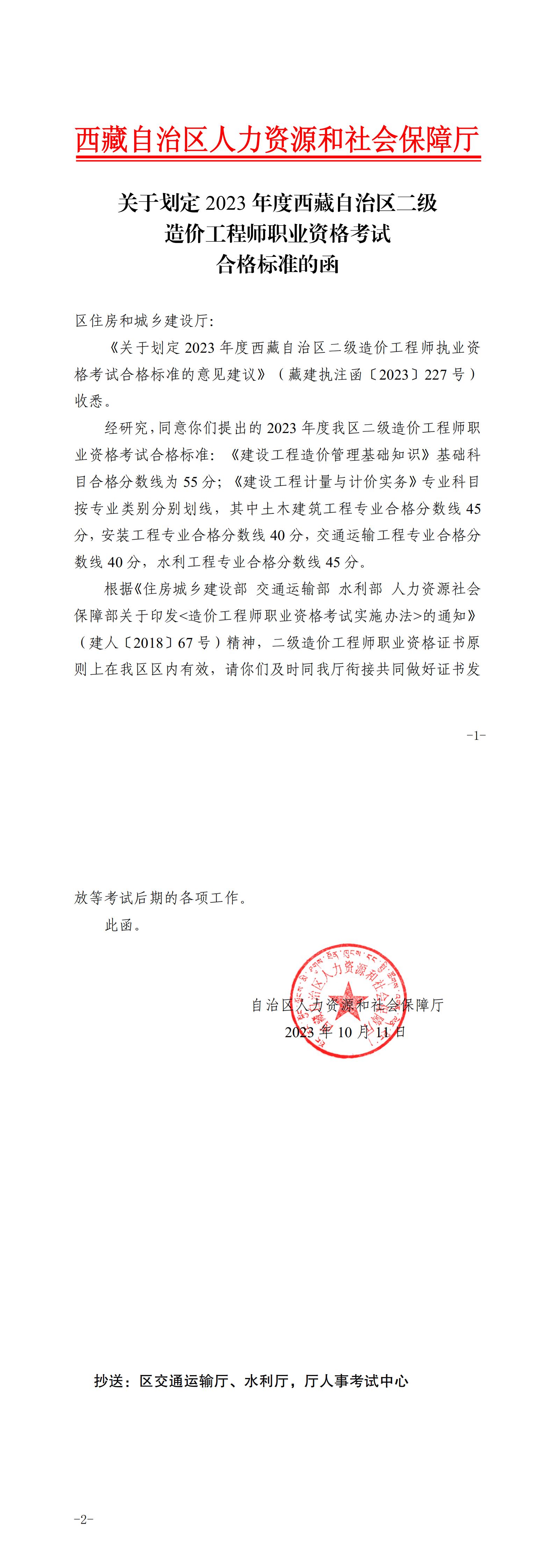 关于划定2023年度西藏自治区二级造价工程师职业资格考试合格标准的函