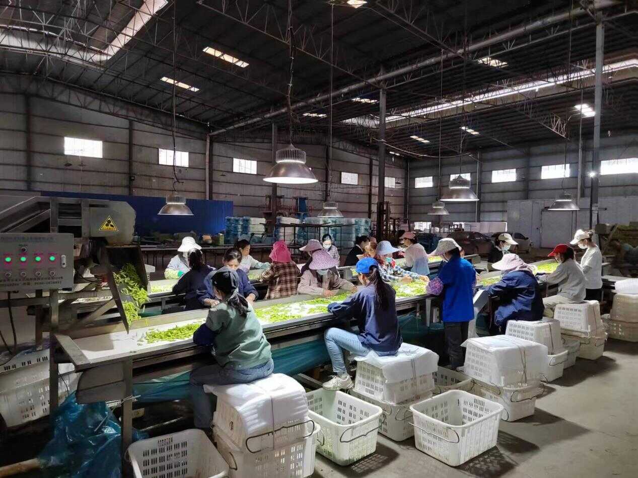 毛豆在加工厂进行清洗和分捡