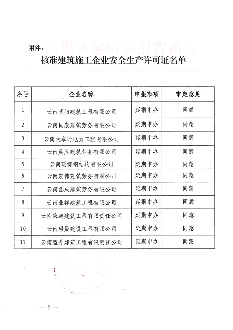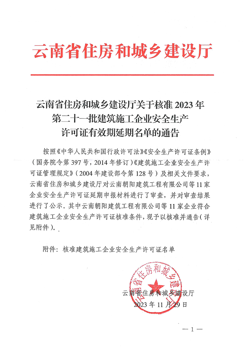 云南省住房和城乡建设厅关于核准2023年第二十一批建筑施工企业安全生产许可证有效期延期名单的通告