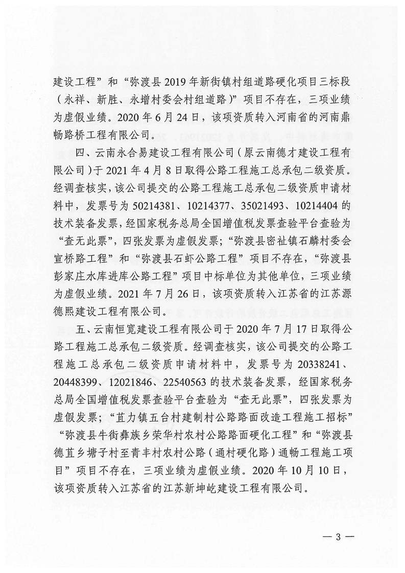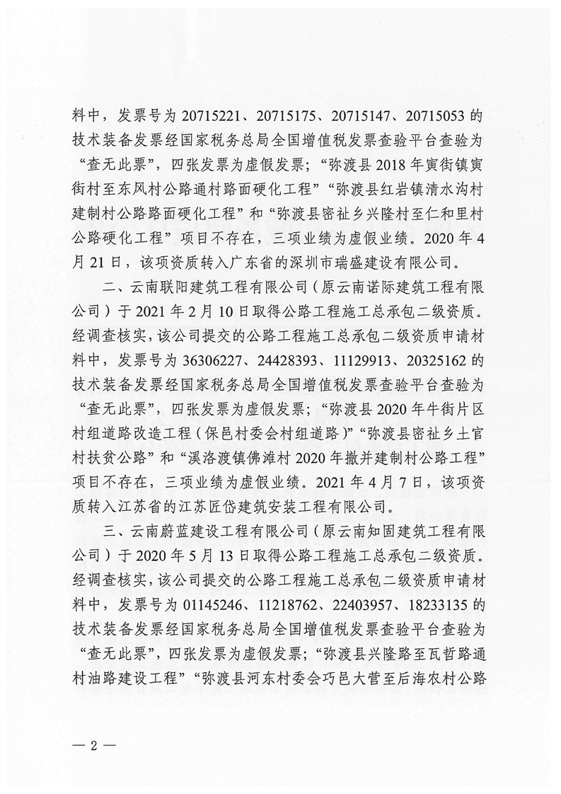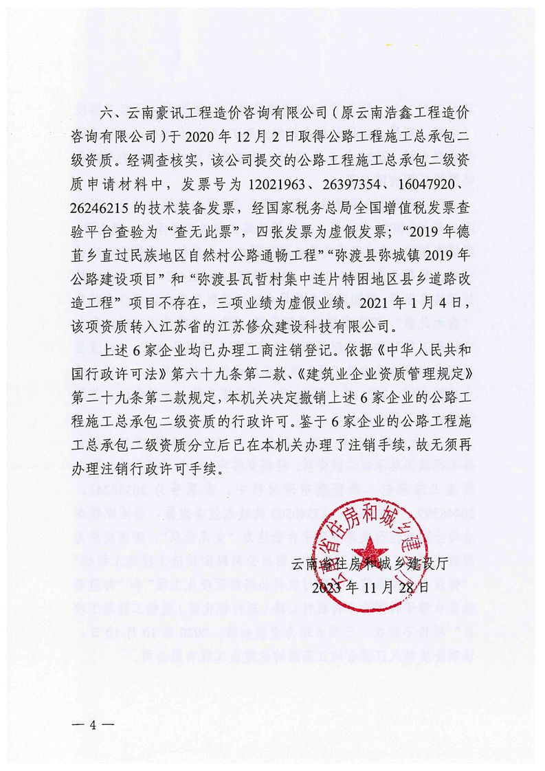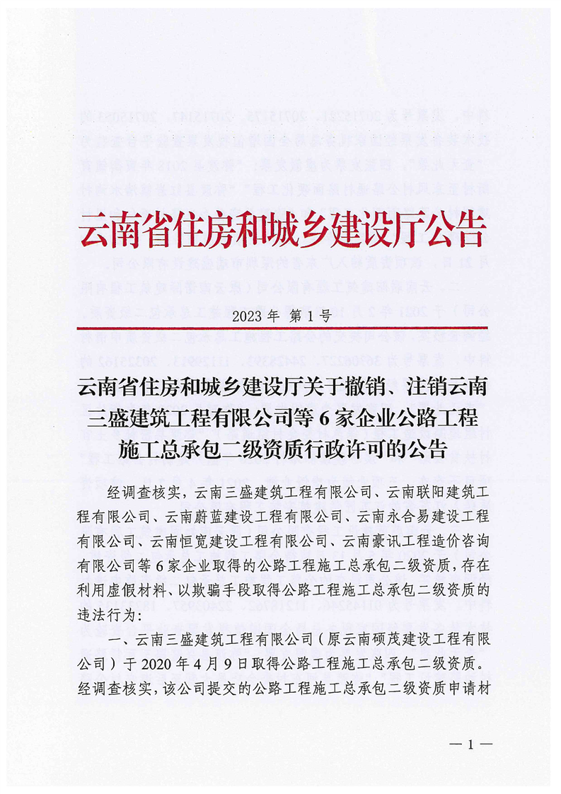 云南省住房和城乡建设厅关于撤销、注销云南三盛建筑工程有限公司等6家企业公路工程施工总承包二级资质行政许可的公告
