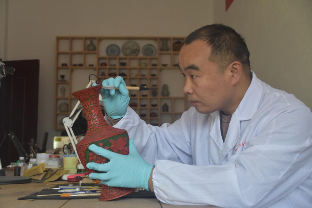在山东省菏泽市郓城县李程漆器馆内,32岁的打磨工李聚盟正在制作漆器,他向记者如数家珍地介绍起漆器制作的泥塑、模具翻制、刮灰、裱布、打磨、上漆等20余道工序。